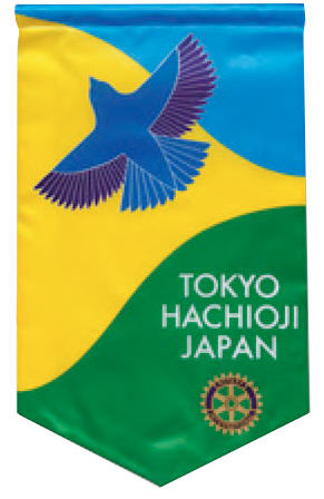 採用されたバナーデザインのは財部(たからべ)礼子(れいこ)さん作のデザインで50周年の時の滝島会長年度の八王子ロータリークラブのテーマである、「22 世紀へ、夢をかたちに、気持ちを行動に」という言葉から、未来へ向けて飛躍していくことをイメージして、八王子の市の鳥であるオオルリが空へはばたく姿をデザインしたものです。