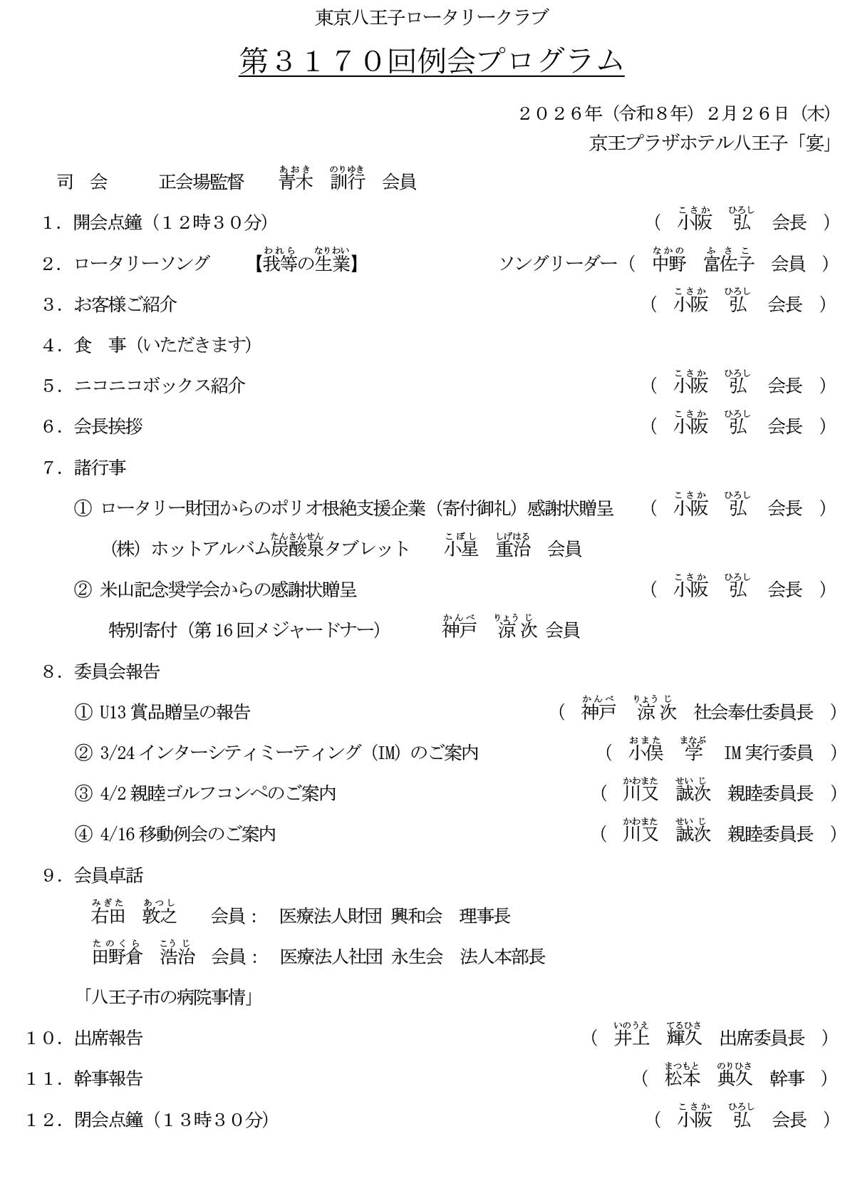 第3170回例会プログラム2026年2月26日(木)